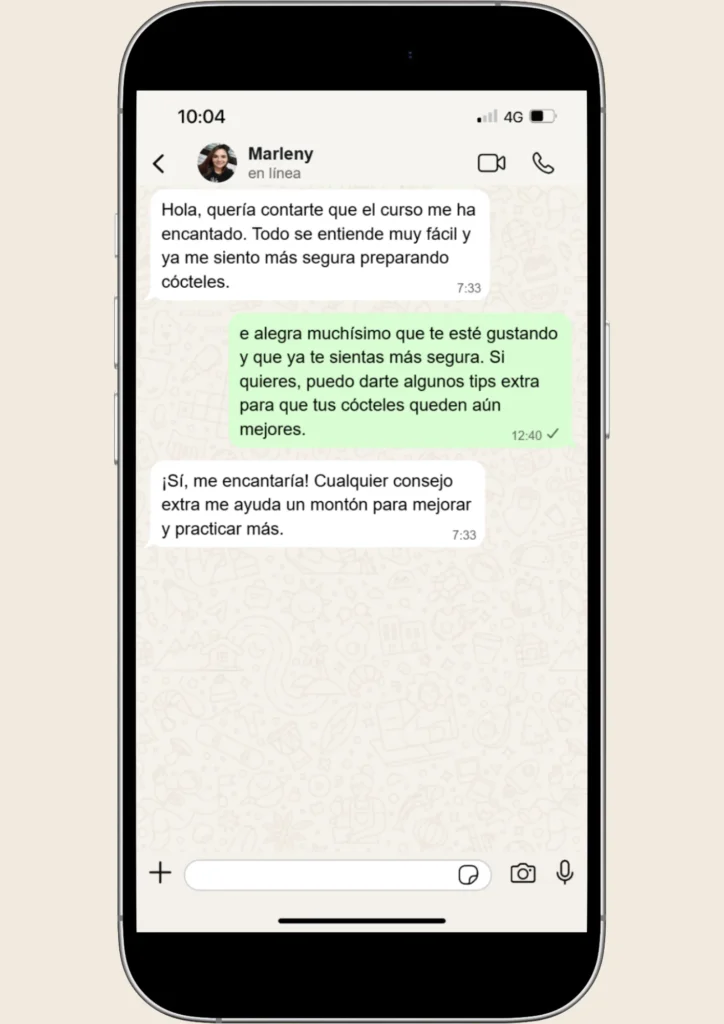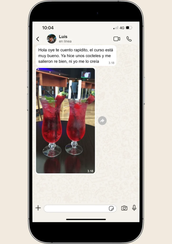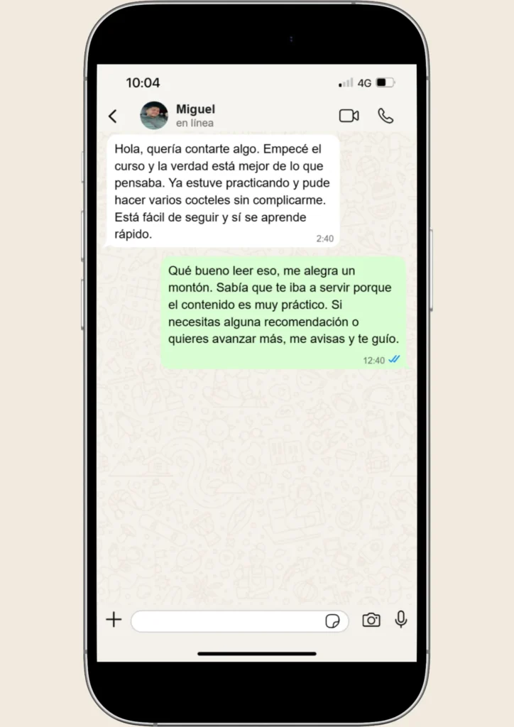 Queremos que tu experiencia en nuestro curso de coctelería sea completamente satisfactoria. Por eso, si dentro de los primeros 7 días consideras que el curso no cumple con tus expectativas, podrás solicitar un reembolso total, sin preguntas complicadas ni trámites engorrosos.